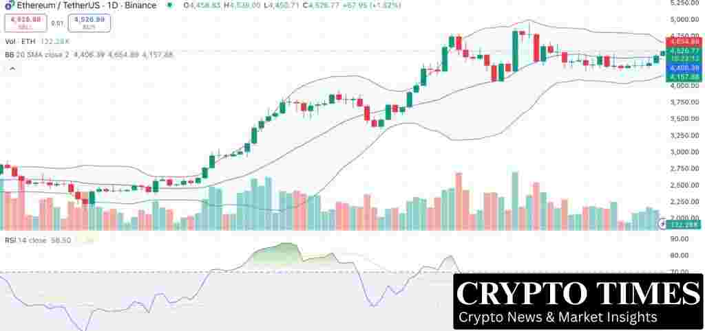 Price action supports a constructive outlook. ETH is still trading above its 20-day moving average, which is near $4,406, while the upper Bollinger Band at $4,654 is acting as resistance. The relative strength index is at 58 and indicating steady demand without approaching overbought territory.